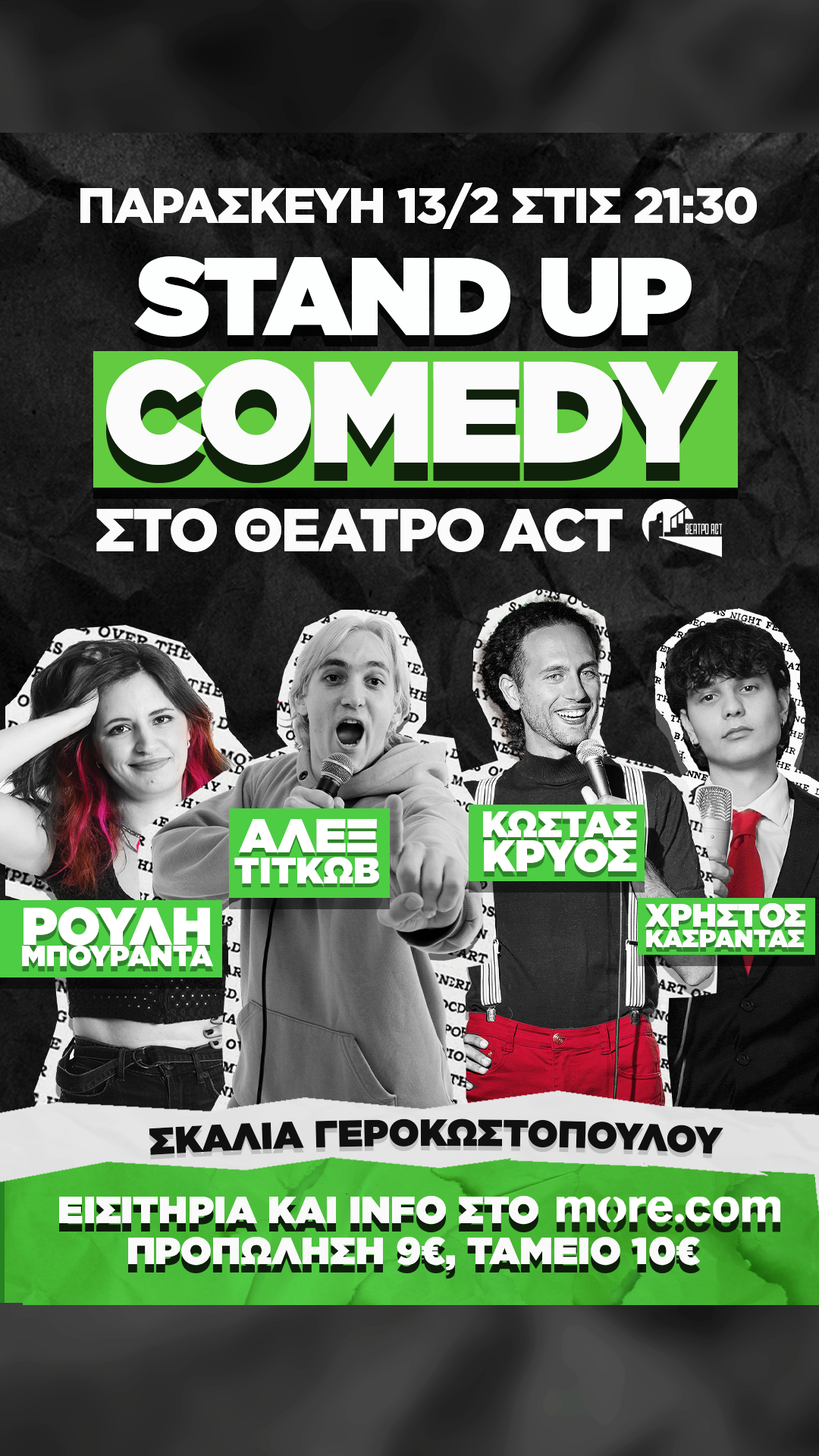 Την Παρασκευή 13/2 το θέατρο ACT φιλοξενεί 4 φοβερούς κωμικούς, τον Αλέξανδρο Τιτκώβ, τον Κώστα Κρύο, την Ρούλη Μπουραντά και τον Χρήστο Κασραντά για μια ξεκαρδαστική Stand-Up Comedy παράσταση!